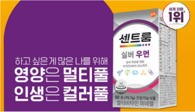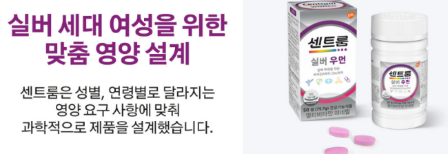 하루 1정으로 13가지 비타민과 9가지 미네랄의 22가지 영양소로 실버 여성을 위한 빈틈없는 기초 영양을 챙길 수 있습니다. 가격은 1통(50정) 기준 센트룸 공식홈페이지에서 27,000원에 판매되고 있습니다.