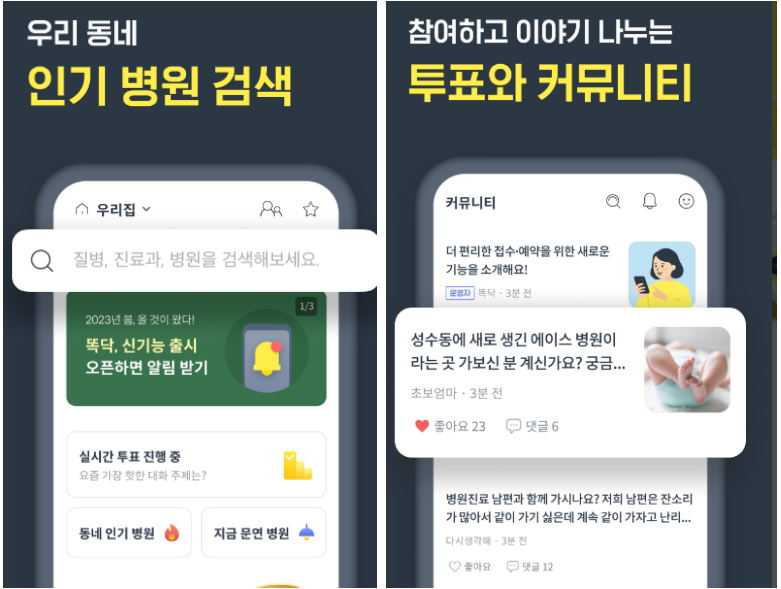 사용법은 매우 간단한데요. 검색창에서 원하는 병원 이름을 검색해서 찾거나 앱 중간에 동네 인기병원, 지금 문 연 병원, 진료과로 병원 찾기 등을 통해 병원을 찾을 수 있습니다.