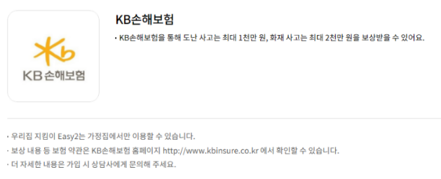 혹시 모를 사고 발생 시 KB손해보험을 통해 도난사고는 최대 1천만 원, 화재사고는 최대 2천만 원까지 보상받으실 수 있습니다. 보안, 방범, 보상까지 정말 알차게 구성돼 있는 상품이라고 생각하시면 됩니다.