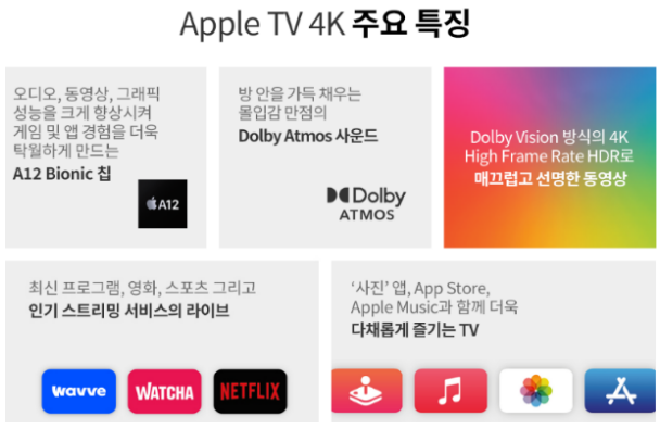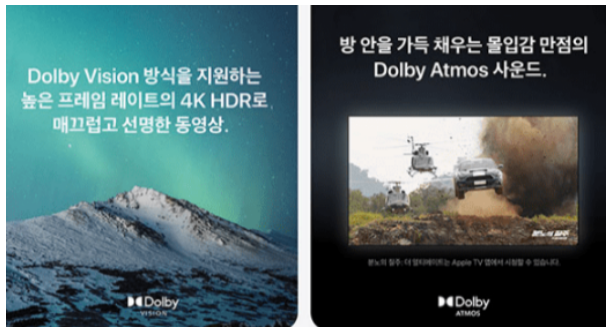 또한 SK브로드밴드 애플TV 셋톱박스는 돌비 비전과 돌비 애트모스를 지원합니다. 돌비 비전은 화질을 크게 향상시켜주는 기능이고, 애트모스는 음질을 향상시켜주는 기능입니다.
