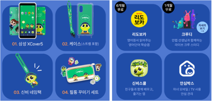 캐릭터 케이스, 투명 커버, 액정 보호필름, 어깨 스트랩, 캐릭터 열쇠고리, 컬러링 페이퍼 2종이 있습니다. 참고로 구성품 외에도 아이들을 위한 콘텐츠와 교육용 앱에는 어떤 게 있는지 살펴보시면 좋습니다.