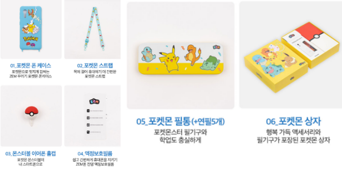 포켓 케이스, 포켓몬 스트랩, 이어폰홀캡, 액정보호필름, 포켓몬 필통, 포켓몬 상자가 있습니다.
