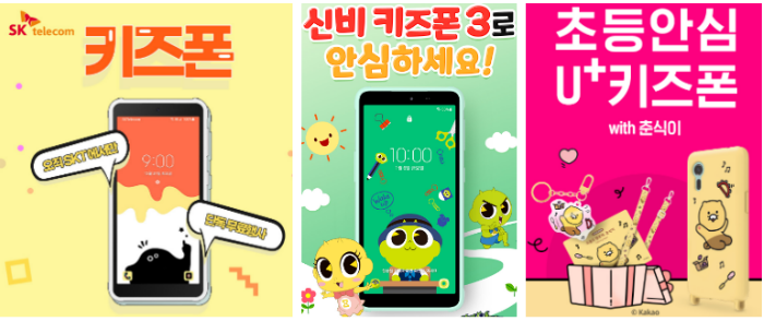 키즈폰에는 SK텔레콤의 ZEM꾸러기 포켓몬에디션, KT의 신비키즈폰3, lg유플러스의 키즈폰 with 춘식이가 있습니다.